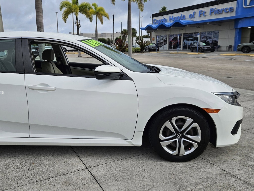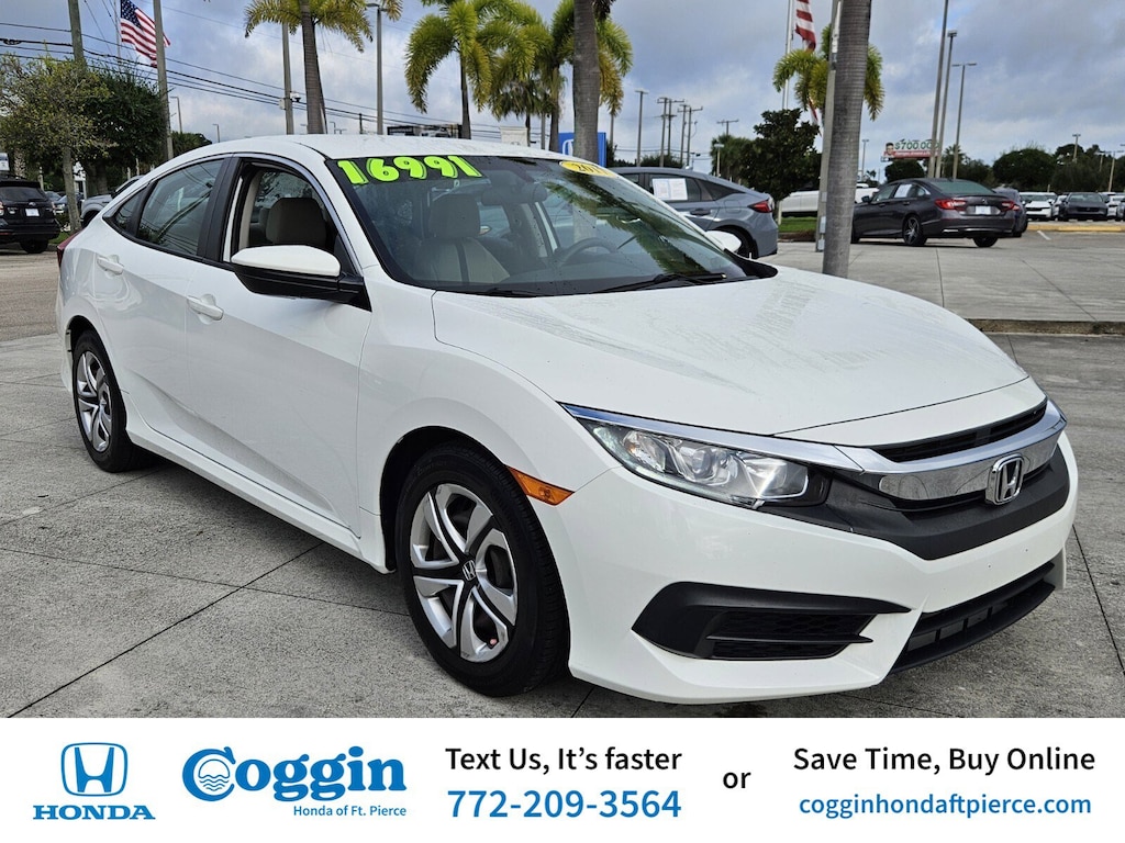 HondaTrue Used! 100 Day 5000 Mile Factory Warranty! 2017 Honda Civic LX HondaTrue Used One Owner Clean Carfax Stock #: CHF260382A VIN: 19XFC2F53HE211065 Odometer: 62908 Sporty style trusted efficiency and certified confidence come together in this 2017 Honda Civic LX in Taffeta White. With only one previous owner and a Clean Carfax this sedan delivers the reliability and value Honda is known for now backed by HondaTrue Used Certification. Key Features & Highlights: **Performance: 2.0L i-VTEC 4-cylinder engine CVT transmission Front-wheel drive Excellent fuel economy** **Interior & Comfort: Spacious cabin Premium cloth seats Automatic climate control Fold-down rear seat for extra cargo versatility** Technology & Convenience: **Multi-angle rearview camera** **Bluetooth HandsFreeLink and streaming audio** **USB audio interface** **Cruise control and keyless entry** **Safety: Vehicle Stability Assist (VSA) Anti-lock braking system Full suite of advanced airbags** HondaTrue Used Benefits Include: **112-point inspection by Honda-trained technicians** **100-day / 5000-mile limited warranty** **Roadside assistance** **Complimentary oil change within the first year** **Flexible Honda Care coverage available** Stylish efficient and certified for confidence this Honda Civic LX is the perfect daily driver with long-term peace of mind. Available now at Coggin Honda of Fort Pierce where dependability meets value.. CARFAX One-Owner. Clean CARFAX. Certified. HONDA TRUE USED Odometer is 29441 miles below market average!FWD CVT 2.0L I4 DOHC 16V i-VTEC 31/40 City/Highway MPGHondaTrue Used Details: * Limited Warranty: 5000 Mile 100-days/5000 miles(whichever comes first) after new car warranty expires or from certified purchase date * Honda Care Roadside Assitance for 1 year/12000 miles whichever comes first). Trip Interruption and Concierge Service for 1 year/12000 miles (whichever occurs first) beginning at the expiration of the New Vehicle Limited Warranty or from the date of sale of the vehicle if the New Vehicle Limited Warranty has expired at the time of sale. 2015 and newer models Honda Roadside Assistance is available throughout the New Vehicle Limited Warranty period. One complimentary oil change within the first year of ownership. SiriusXM 90-Day free trial. * Powertrain Limited Warranty: 5000 Mile 100-days/5000 miles(whichever comes first) after new car warranty expires or from certified purchase date * Warranty Deductible: $0 * 112 Point Inspection * Transferable Warranty * Roadside Assistance * Vehicle HistoryAwards: * 2017 IIHS Top Safety Pick (When equipped with Honda Sensing) * 2017 KBB.com 10 Most Awarded Brands * 2017 KBB.com Brand Image AwardsKelley Blue Book Brand Image Awards are based on the Brand Watch(tm) study from Kelley Blue Book Market Intelligence. Award calculated among non-luxury shoppers. For more information visit www.kbb.com. Kelley Blue Book is a registered trademark of Kelley Blue Book Co. Inc.